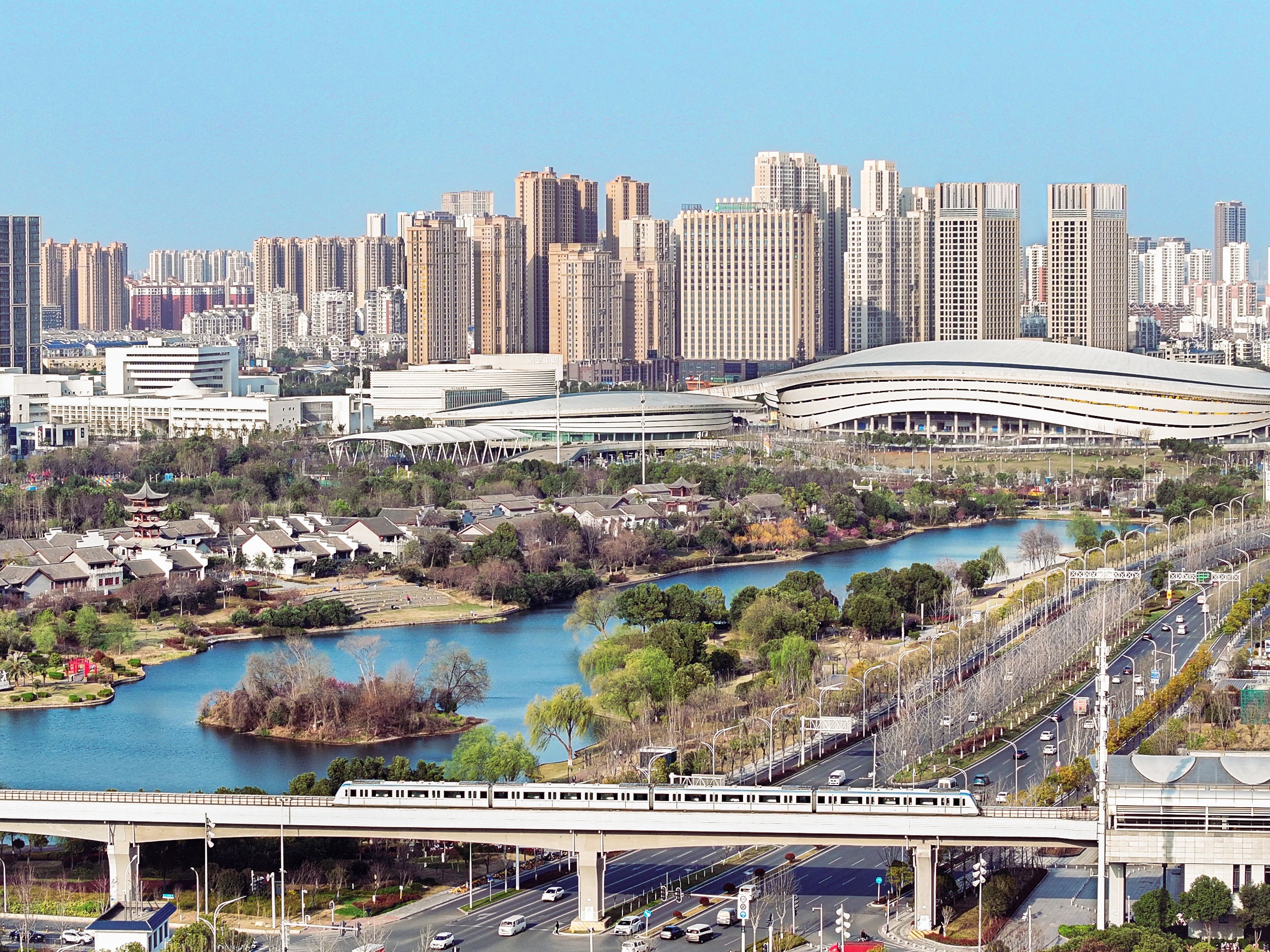 列车驶过城市公园。